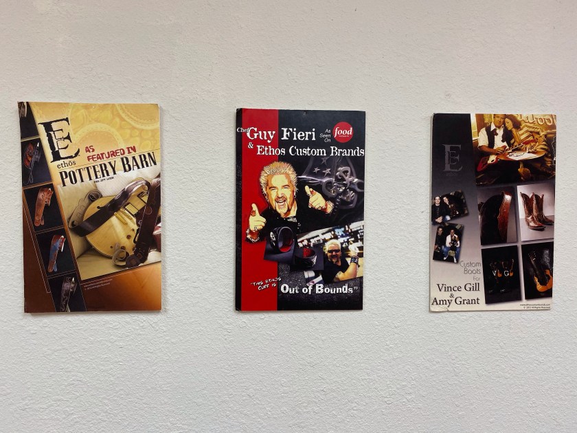 We went immediately to the shop, Ethos Custom Brands. This is the leather shop where boots and guitar straps and all the amazing accessories are designed, created and shipped out. But it is also filled with music. When we arrived and for the next several hours, there was the most beautiful soft voice singing Billie Eilish songs coming from the back. As I rounded the corner, I was amazed to find it was Chad’s 9 year old daughter singing karaoke! Such a beautiful voice. Chad’s older daughter also treated us to a tune. Both were impressive.