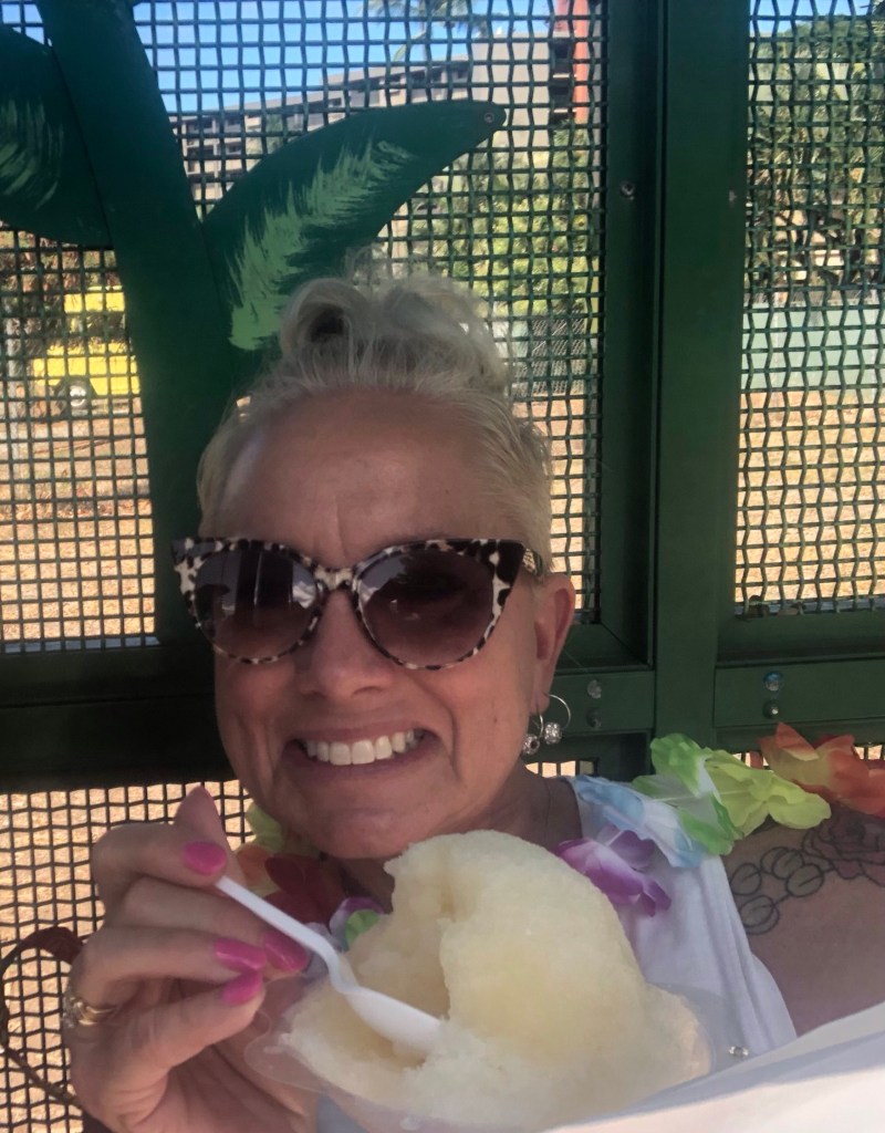 We took our stuff back to the condo then headed out to the bus stop. Had to get a pineapple shaved ice while we waited for the bus of course. My leg burned in the ten minutes we sat.