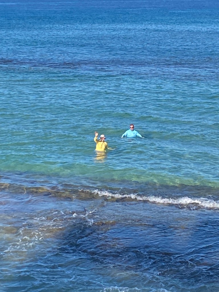 I am not a water baby. It took til this afternoon for me to finally stop watching for the waves to come. Because the waves break on the first reef, they never will break over our heads in between the reefs. If I am watching for them, I take a little jump to lift me off my feet. Today I realized the wave will lift me up and I don’t need to jump. I even back floated. We tried floating on the boogie boards (you can’t boogie board these waves because you can’t get on top the waves due to the reef). My favorite positive is tucked, facing the waves with my feet and floating over them.