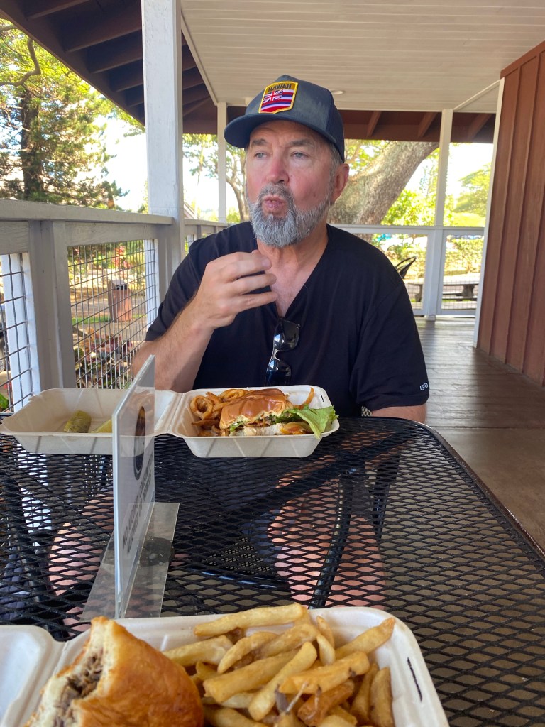 Eventually, four miles down the road, we came to a golf course and zip lining and shopping area, very high end. We drove around looking for the place we planned to hike and stopped at a nice shop for a sandwich. It was amazing! I had a prime rib French dip and Scott had a bbq bacon ranch grilled turkey. The shop was a lot like the ABC stores we’ve been impressed with so we did some more shopping. We ate outside then took off to find the hike.