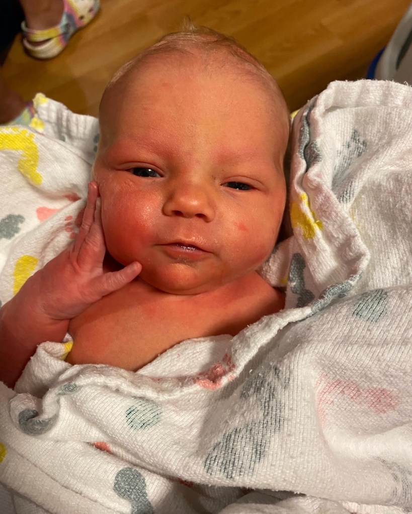 I drove to the house and waited with Kent’s Mom, Dawn. We got tired of waiting after hearing that Hannah had started pushing so we went to the hospital and hung around Subway and the benches outside. Hannah pushed for 2 1/2 hours and I had started to get worried. Finally, we got word that little June had been born.