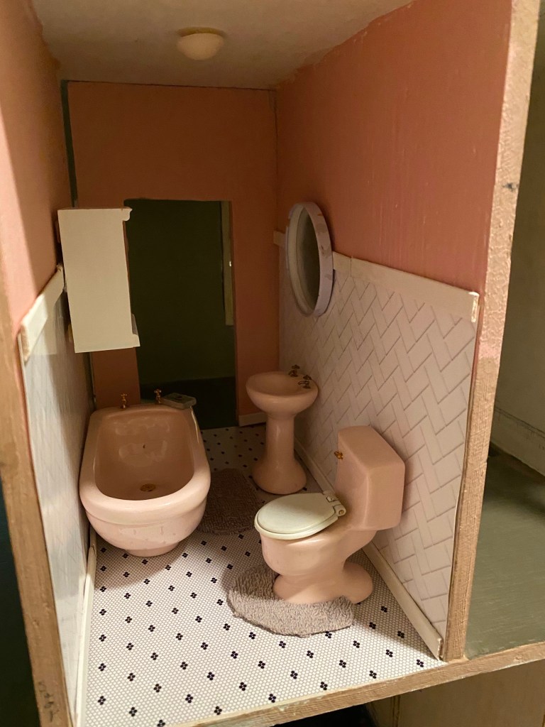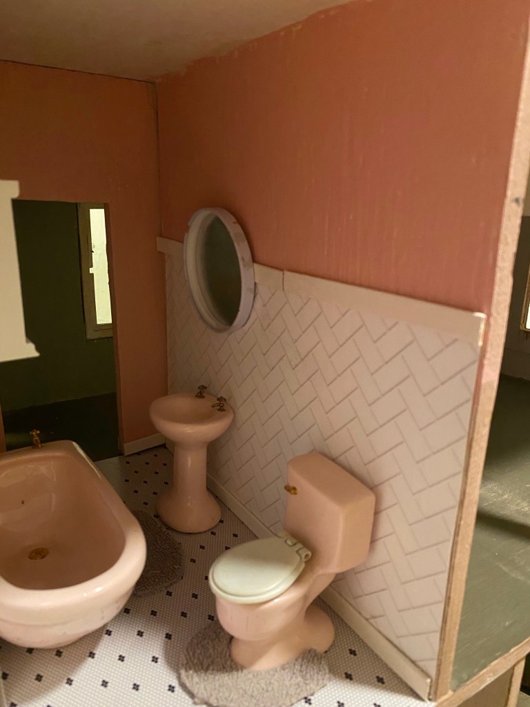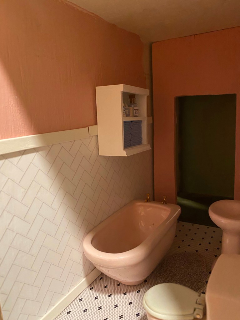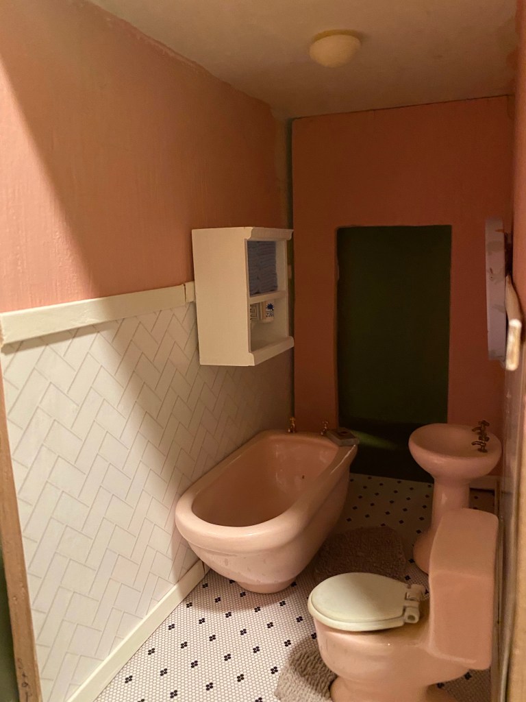 So I strarted on the bathroom and kitchen. I painted the ceilings and put in the floor, baseboards, and tile. I added the toilet, tub and sink then found a lid to use for the mirror and a button for the light fixture. I used the glue gun to get the shelf and mirror to stick. Oh, and I cut rugs from an old washcloth. I don’t love it but it’ll do.