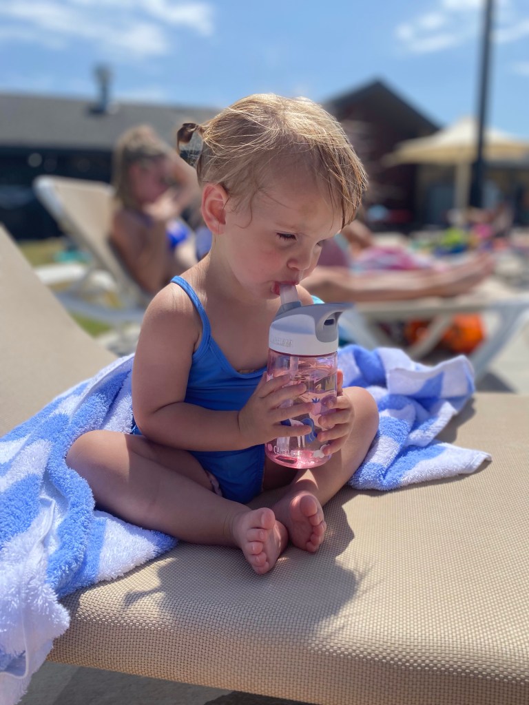 We put on the kids’ floaties and got in the baby pool. The kids giggled and splashed and grinned the entire time. Emmet practiced his back floating and Eleanor had to imitate him, complete with closed eyes. All three swam to me with their little arms out. Eleanor loved the kite that someone was flying nearby and kept pointing it out. Eleanor got cold periodically and would come sit with me on the patio chairs, wrapped in her little towel. She sat calmly and just watched people.