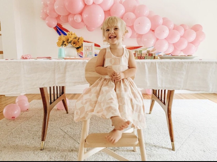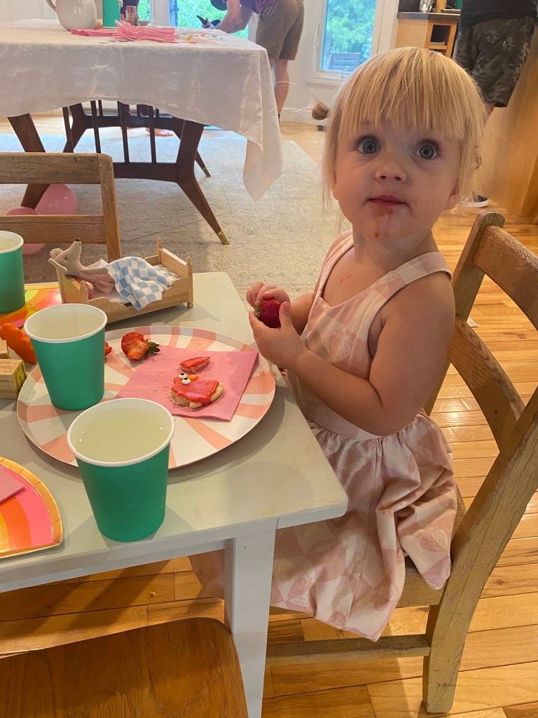 Eleanor wore a sweet, longish pink backless dress with cross cross straps. Her sweet little arms were bare. She danced and pranced around in it. Her hair was in pigtails with bangs.