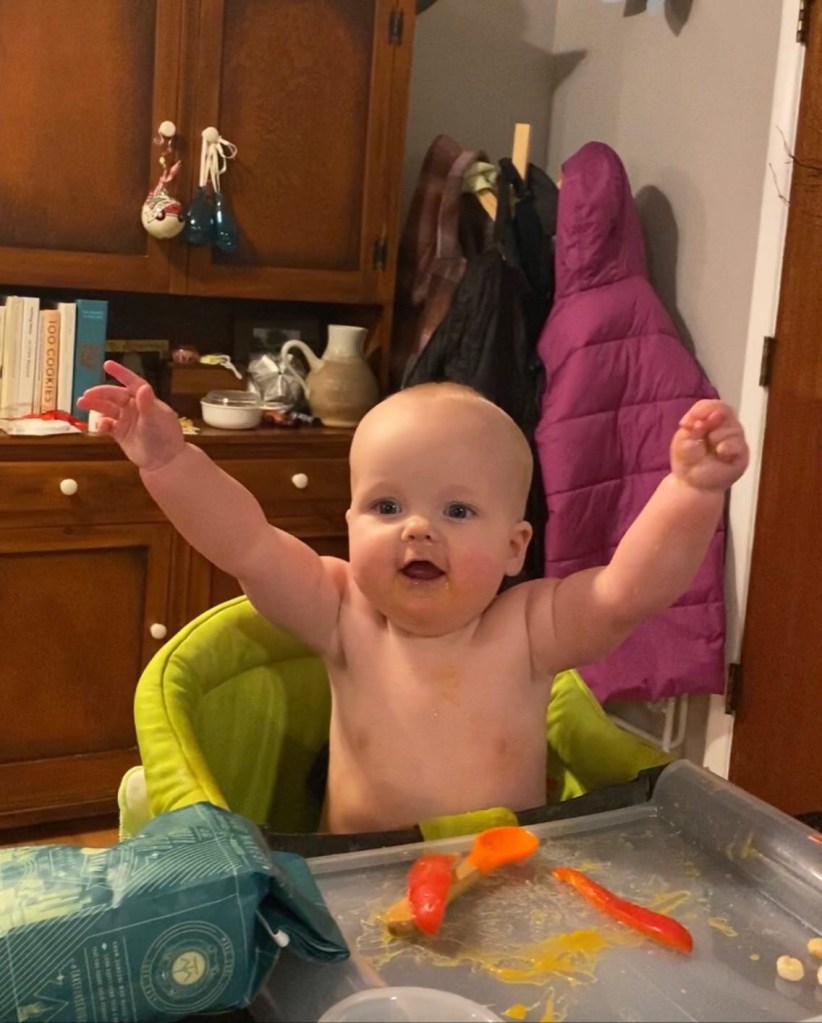 June is so sweet. She has the funkiest crawl. She loves to wave at me. She has found her voice and expresses herself often, loudly. Her smile is earned. She wants to walk soon. She loves her Mama most and her daddy.