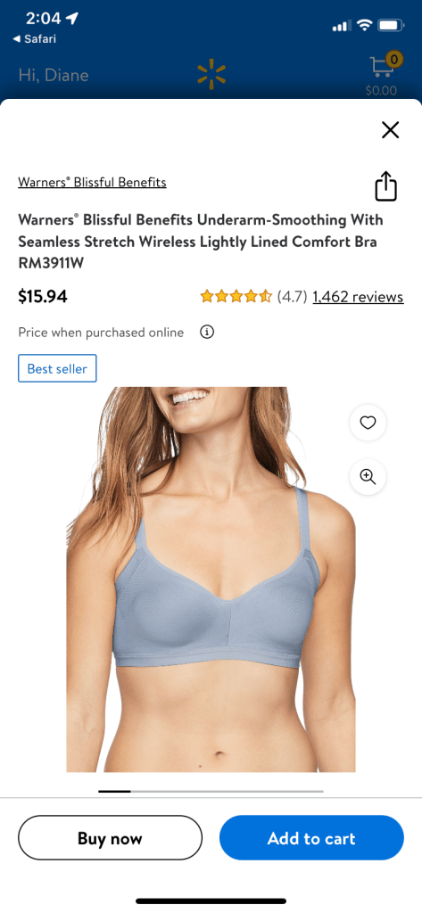 I went to a women’s retreat last weekend and my roomie had the most comfie looking bra. Where did she get it? Walmart! Are you freaking kidding me? So I made a trip and purschased a Warner bra in blue. It fits perfect and it’s so comfy! 15 bucks! Who knew?