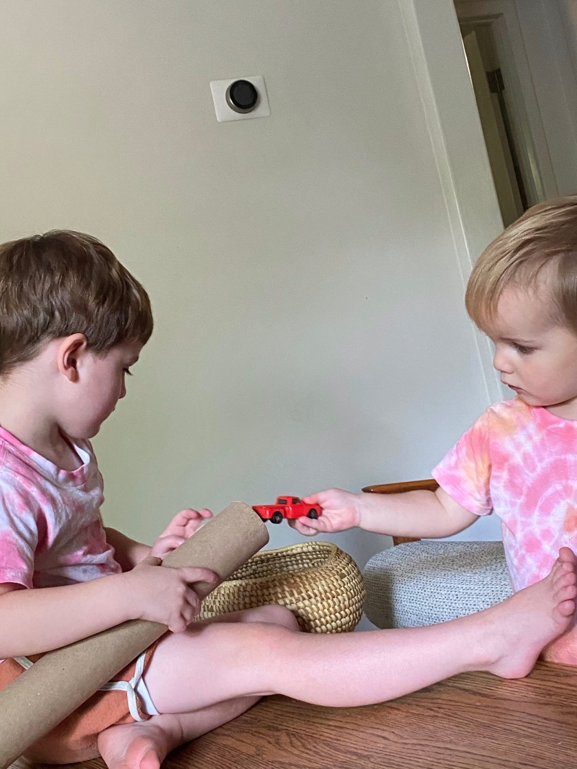 Shortly after I arrived, Leah brought out a long, hard cardboard tube. The boys set it up against the coffee table and started shooting cars through it. They did this tirelessly for hours on end. Later, they started peeking at each other through the tube and eventually talked through it. I even had them doing mountain calls through it like on the Riccola ad.