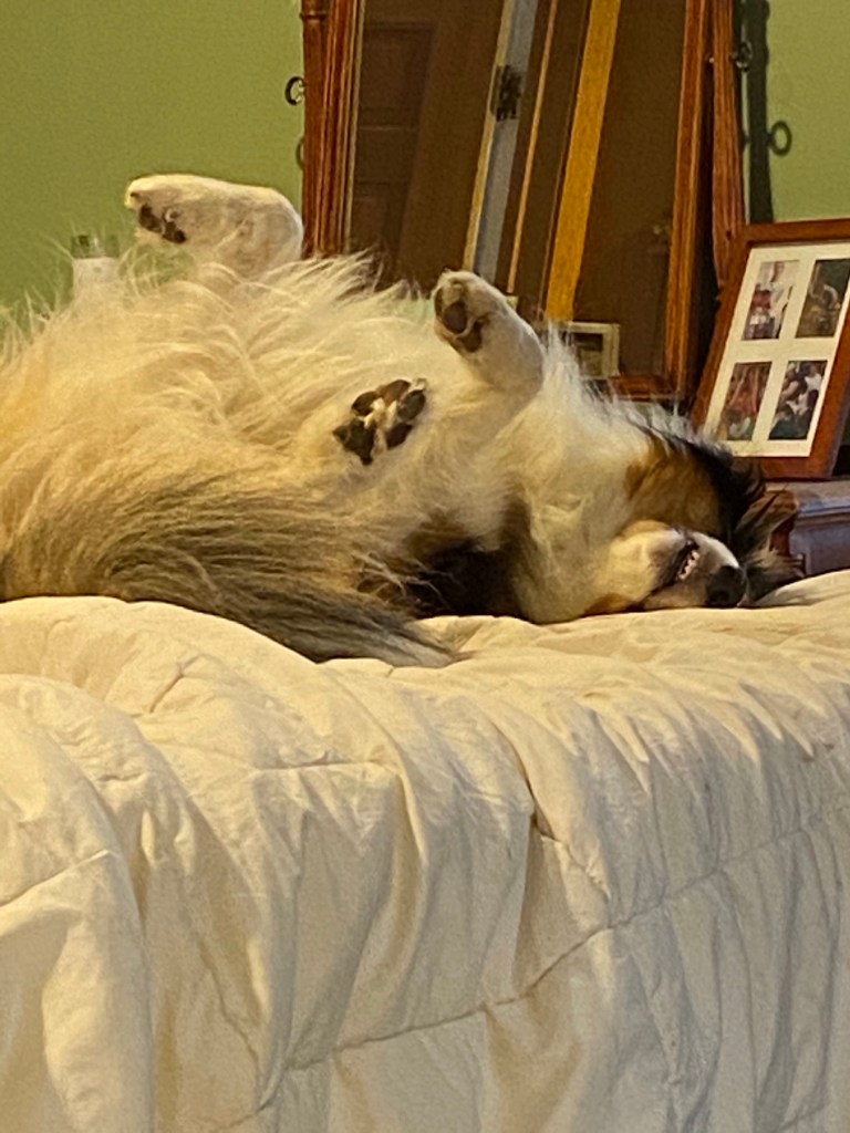 When on the bed or the couch, he sleeps on his back. He used to not let me, but now does let me scratch his tummy. He loves to have the fur on his back next to his tail scratched.