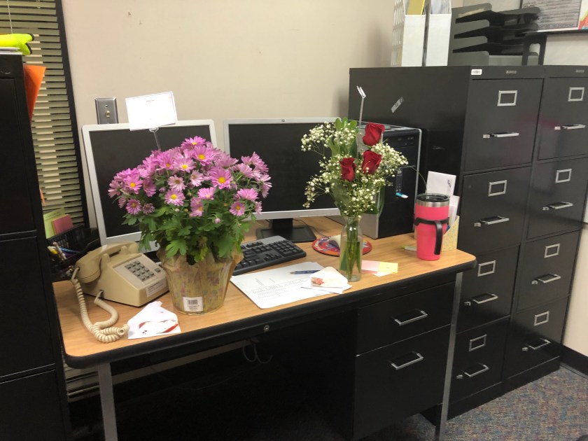 Then the last day came. I knew it would be hard. I started the day at a doctor office for the first hour and a half. When I walked in to school, these flowers from Scott and Pastor Dave were on my desk.
