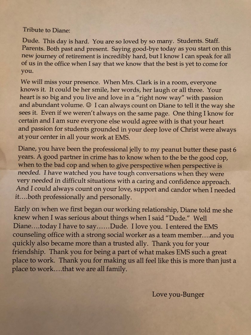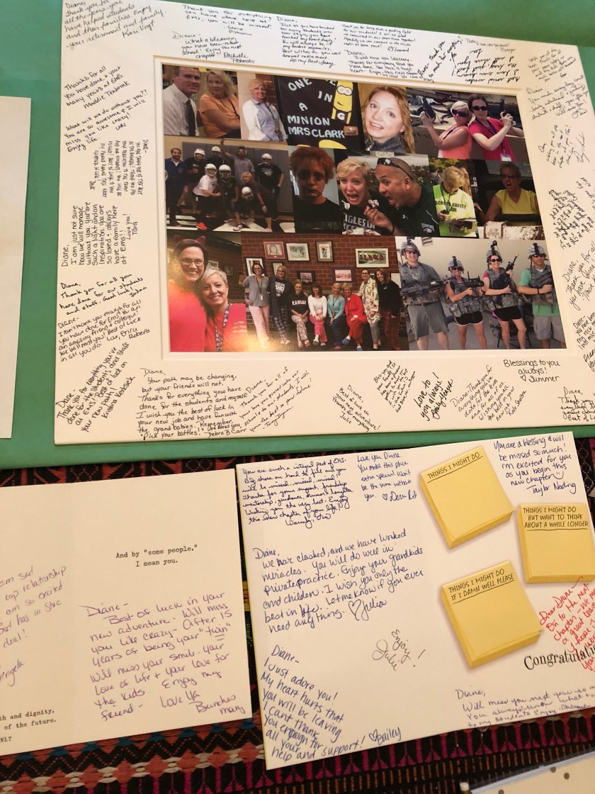 This has been such an emotional few weeks as I wrapped up my last school year as a school social worker. I love my job and my co-workers. When I found out that I had met the 85 rule for KPERS, I prayed, met with Scott and HR, met with Courser Lapo and made the decision to do it. It lined up perfectly and felt right. It was confirmed by knowing that Leah and my Mom need more, I haven’t seen my Dad in a very very long time, and then having cancer certainly changes everything. I am ready to go deeper with people both personally and professionally. Having a ridiculous number of kids on my caseload requires so much energy. The schools are in such a process of change. So I knew this was right, but that didn’t make it easy. Not by a long shot.